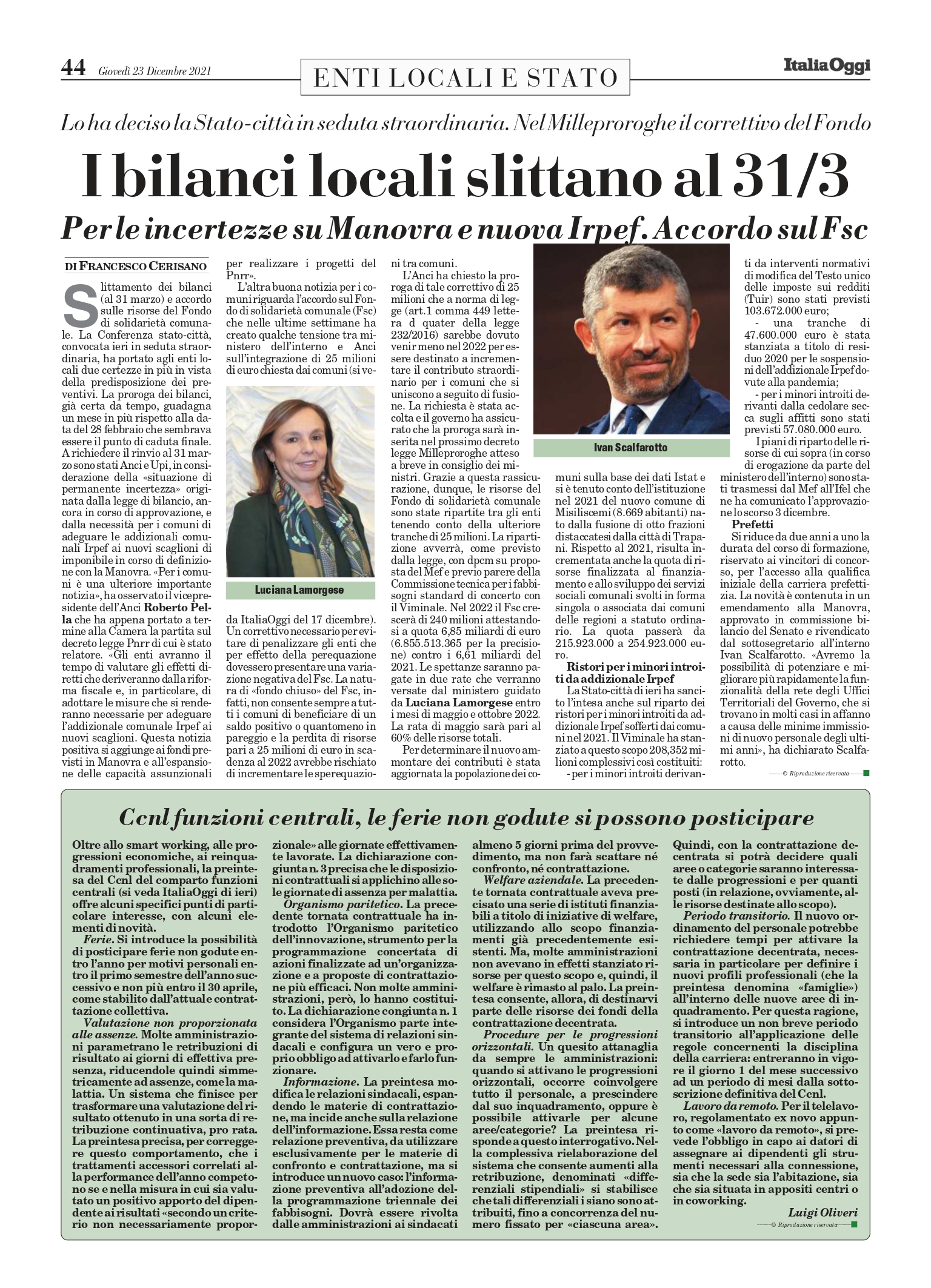 Slittamento dei bilanci (al 31 marzo) e accordo sulle risorse del Fondo di solidarietà comunale. La Conferenza stato-città, convocata ieri in seduta straordinaria, ha portato agli enti locali due certezze in più in vista della predisposizione dei preventivi. La proroga dei bilanci, già certa da tempo, guadagna un mese in più rispetto alla data del 28 febbraio che sembrava essere il punto di caduta finale. A richiedere il rinvio al 31 marzo sono stati Anci e Upi, in considerazione della «situazione di permanente incertezza» originata dalla legge di bilancio, ancora in corso di approvazione, e dalla necessità per i comuni di adeguare le addizionali comunali Irpef ai nuovi scaglioni di imponibile in corso di definizione con la Manovra. «Per i comuni è una ulteriore importante notizia», ha osservato il vicepresidente dell’Anci Roberto Pella che ha appena portato a termine alla Camera la partita sul decreto legge Pnrr di cui è stato relatore. «Gli enti avranno il tempo di valutare gli effetti diretti che deriveranno dalla riforma fiscale e, in particolare, di adottare le misure che si renderanno necessarie per adeguare l’addizionale comunale Irpef ai nuovi scaglioni. Questa notizia positiva si aggiunge ai fondi previsti in Manovra e all’espansione delle capacità assunzionali per realizzare i progetti del Pnrr».