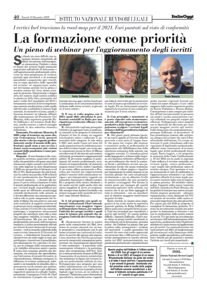 A pochi giorni dalla fine dell’anno i vertici dell’Inrl tracciano il consuntivo 2020 e illustrano a ItaliaOggi la road-map per il 2021 con le priorità della formazione e delle relazioni con istituzioni, università e mondo professionale.