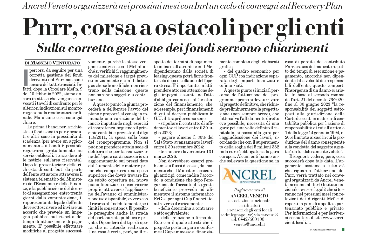 NotizieRassegna Stampa Enti locali e PNRR, la corsa ad ostacoli dei bandi Admin Inrl 13 Maggio 2022 Su ItaliaOggi una disamina aggiornata dell’Ancrel-Veneto, partner dell’Inrl nel recente convegno organizzato presso il Cnel a Roma, sulle crescenti difficoltà in tema di Pnrr-enti locali. Post Views: 818
